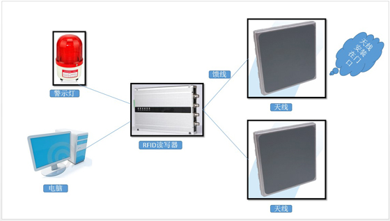 RFID商店智能報警系統(tǒng)中天線安裝尤為重要,首先應(yīng)根據(jù)店鋪的實際大小及需監(jiān)控的范圍來對天線個數(shù)及尺寸進(jìn)行選型。在店鋪的監(jiān)控區(qū)中可安裝2 個RFID天線,該兩個天線識別范圍可允許重疊,從而保證監(jiān)控區(qū)被覆蓋。在柜臺安裝一個桌面發(fā)卡器,通過該天線對已銷售貨品上的標(biāo)簽注銷。