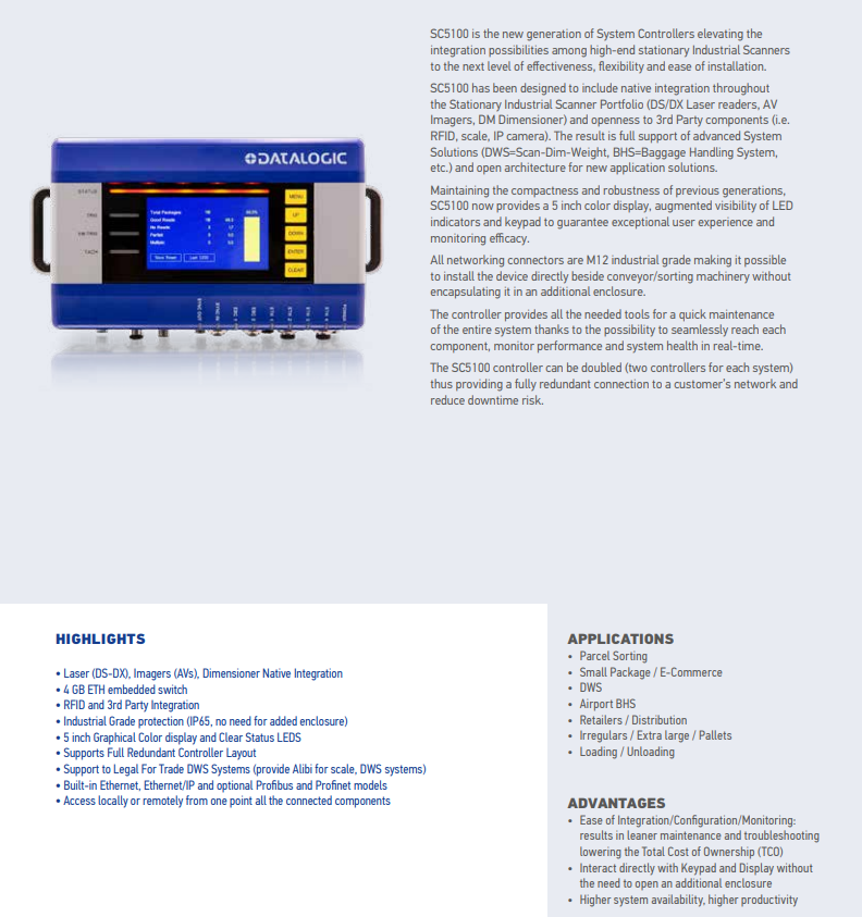 得利捷SC5100固定式工業(yè)系統(tǒng)控制器的設(shè)計(jì)包含了整個(gè)固定式工業(yè)掃描器組合(DS/DX系列激光閱讀器、AV系列掃描器、DM系列體積測(cè)量?jī)x)的本公司產(chǎn)品集成,且支持第三方組件(如RFID、秤、網(wǎng)絡(luò)相機(jī))的集成開(kāi)放接口。其結(jié)果是完全支持的系統(tǒng)解決方案(DWS=Scan-Dim-Weight,BHS=Baggage Handling等),并為新的應(yīng)用解決方案提供