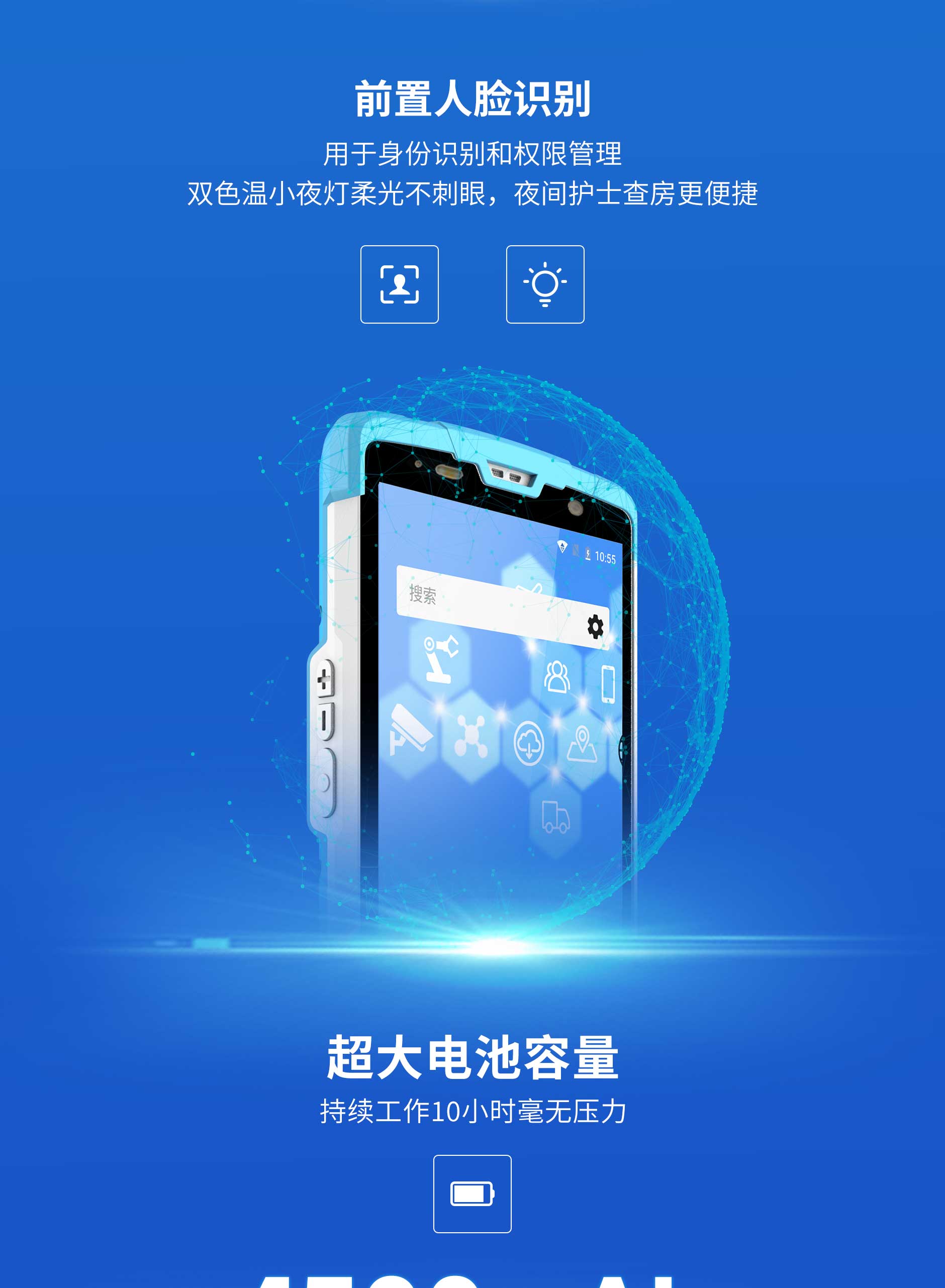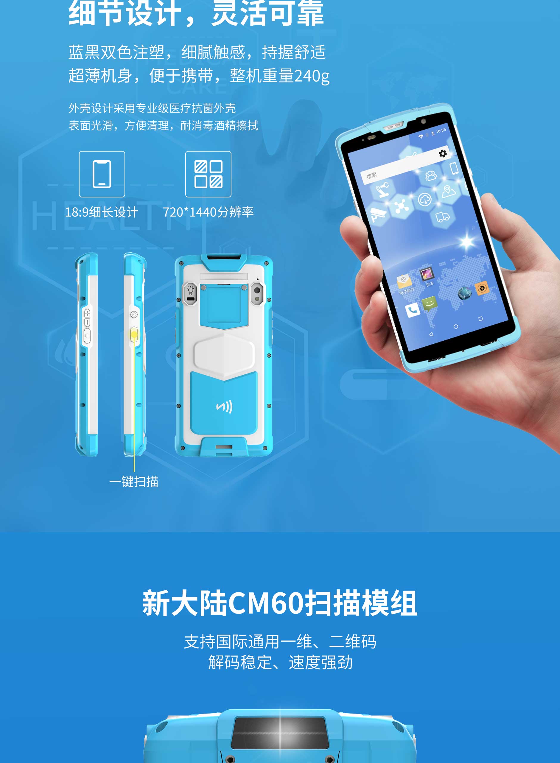 思必拓SD55MD醫(yī)療手持終端SD55MD 基本參數(shù)處理器8核 2.0GHz操作系統(tǒng)Android 8.1存儲(chǔ)RAM:4GB ROM :64GB屏幕尺寸5.5寸 IPS高亮屏機(jī)器尺寸150*72.5*15mm重量240g攝像頭后置1300萬自動(dòng)對(duì)焦攝像頭;高亮度LED閃光燈,前置500萬定焦攝像頭音頻前置雙立體聲揚(yáng)聲器,音量90db±3db(測試距離10cm)傳感器地磁,加速,光感距離按鍵2個(gè)
